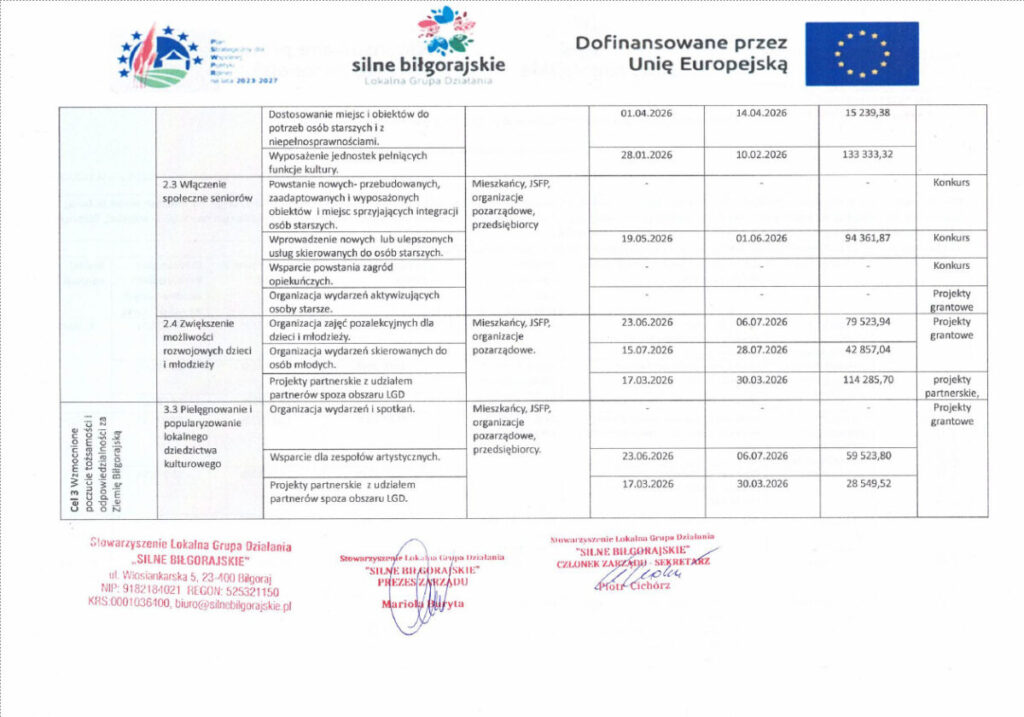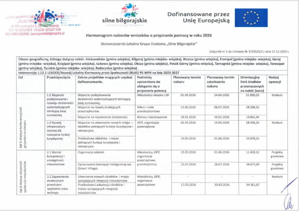 Lokalna Grupa Działania „Silne Biłgorajskie” informuje o przyjęciu harmonogramu naboru wniosków o przyznanie pomocy w 2026 roku, realizowanych w ramach Lokalnej Strategii Rozwoju. Nabory są skierowane do mieszkańców obszaru LGD, organizacji pozarządowych, przedsiębiorców oraz jednostek sektora finansów publicznych i dotyczyć będą przedsięwzięć służących rozwojowi lokalnemu, zgodnych z celami LSR.
