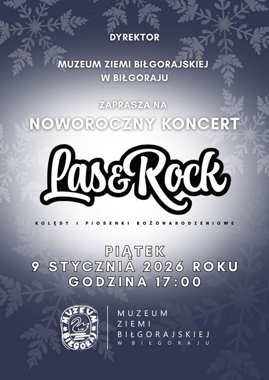 Zaproszenie na koncert noworoczny KONCERT NOWOROCZNY w Muzeum Ziemi Biłgorajskiej w Biłgoraju.Zapraszamy na kolędy i piosenki bożonarodzeniowe w wykonaniu zespołu LAS&ROCK. Koncert odbędzie się 9 stycznia 2026 r. o godzinie 17.00 w Muzeum Ziemi Biłgorajskiej w Biłgoraju. SERDECZNIE ZAPRASZAMY!